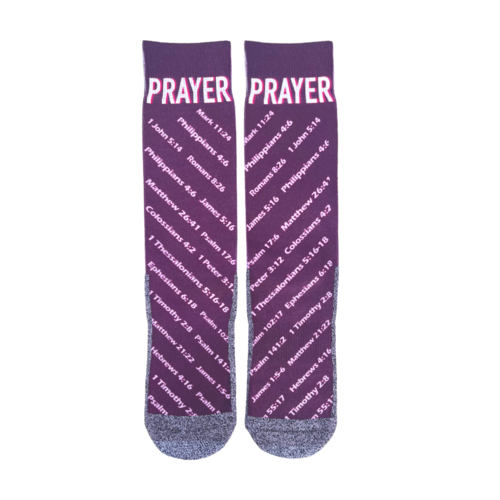 Some of the best Bible verses on PRAYER subtly make their way in light purple stripes onto a classy burgundy sock ready to be read or taught at anytime. Need to teach a lesson or give a sermon? Just hike up your pant leg and you’re ready to go! Way to go, you Bible Scholar!