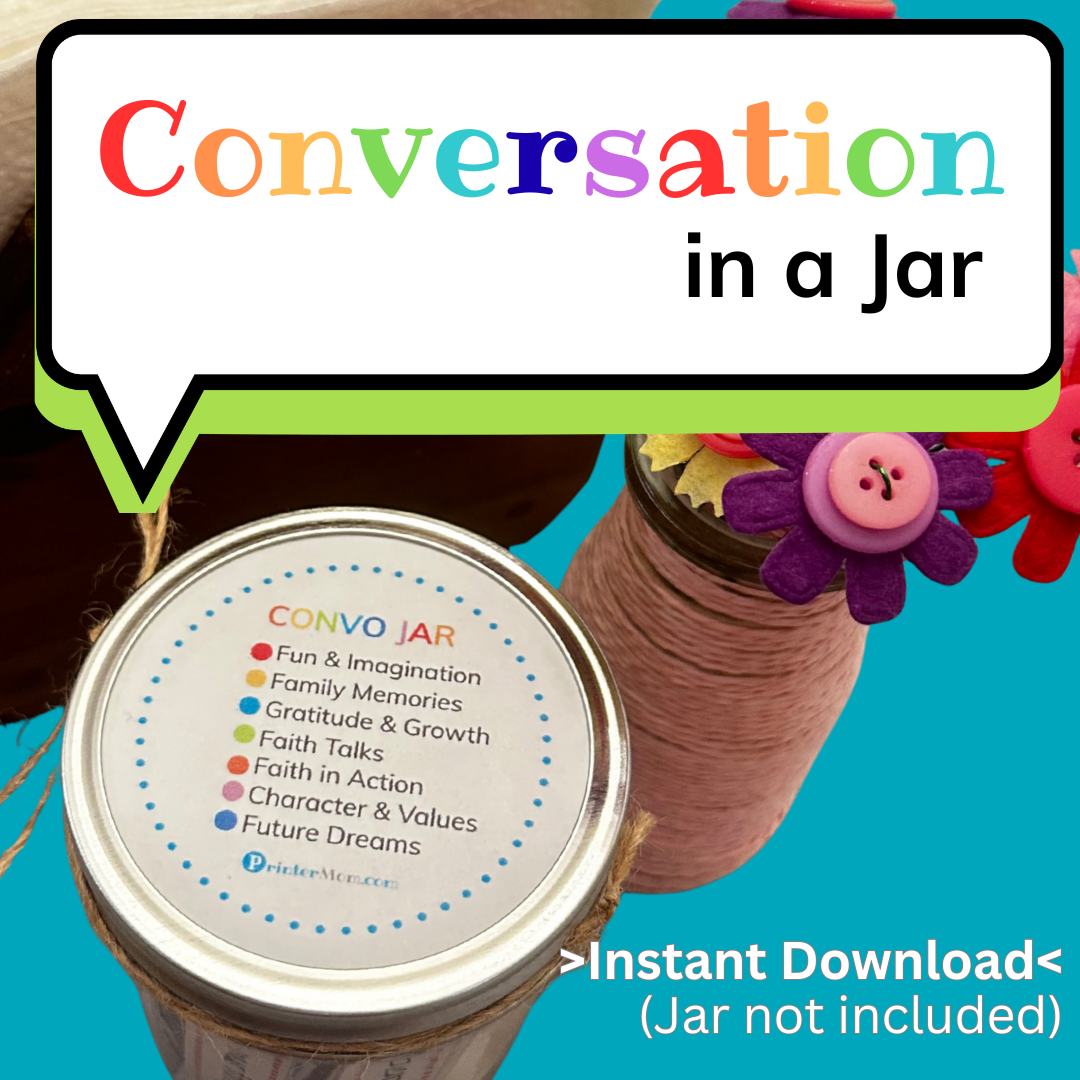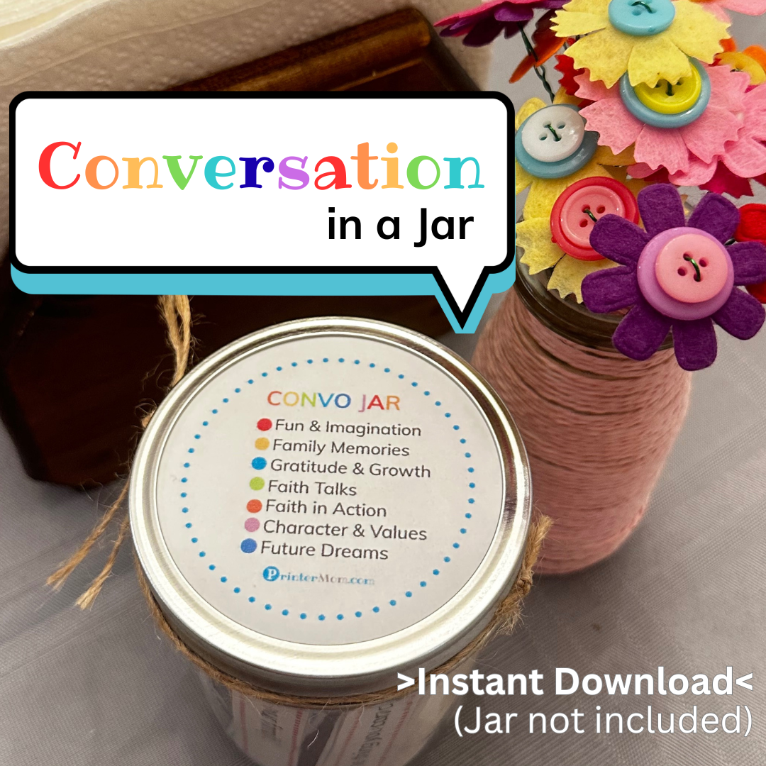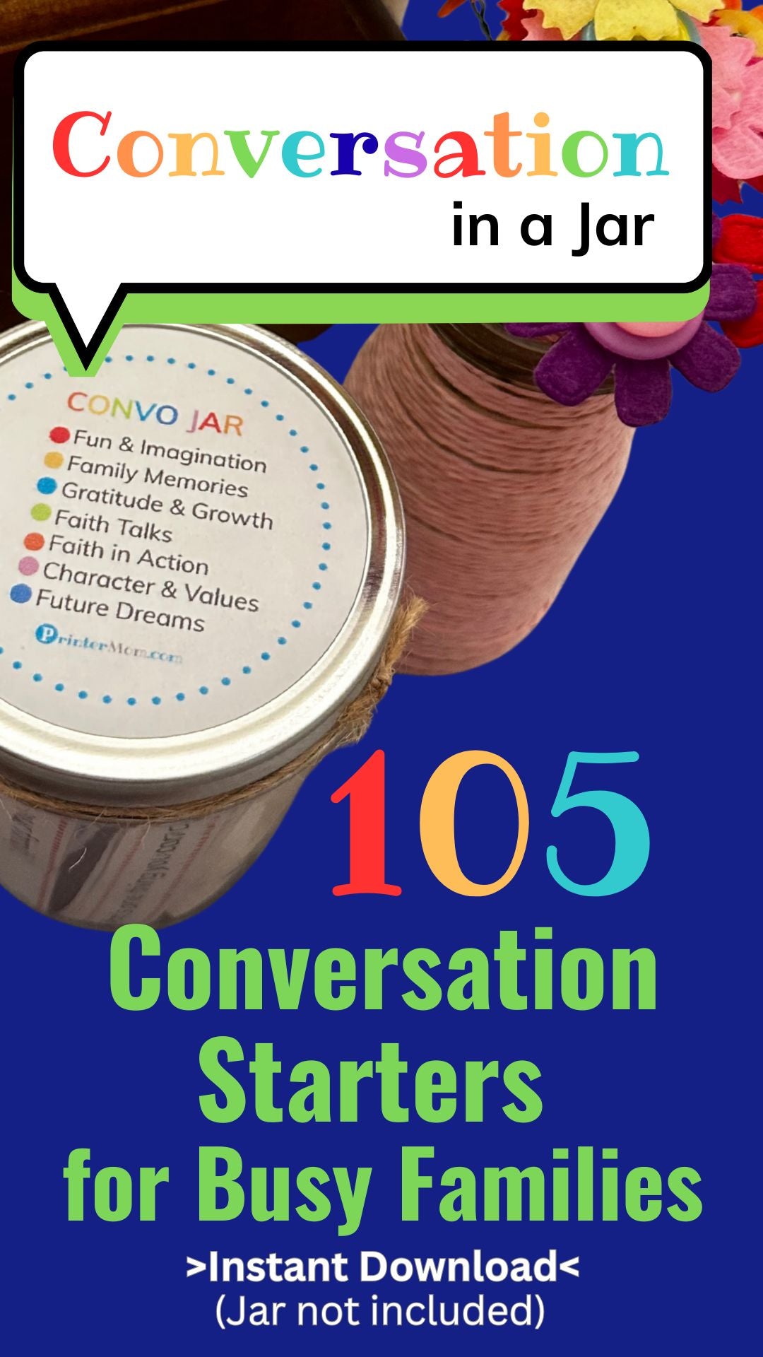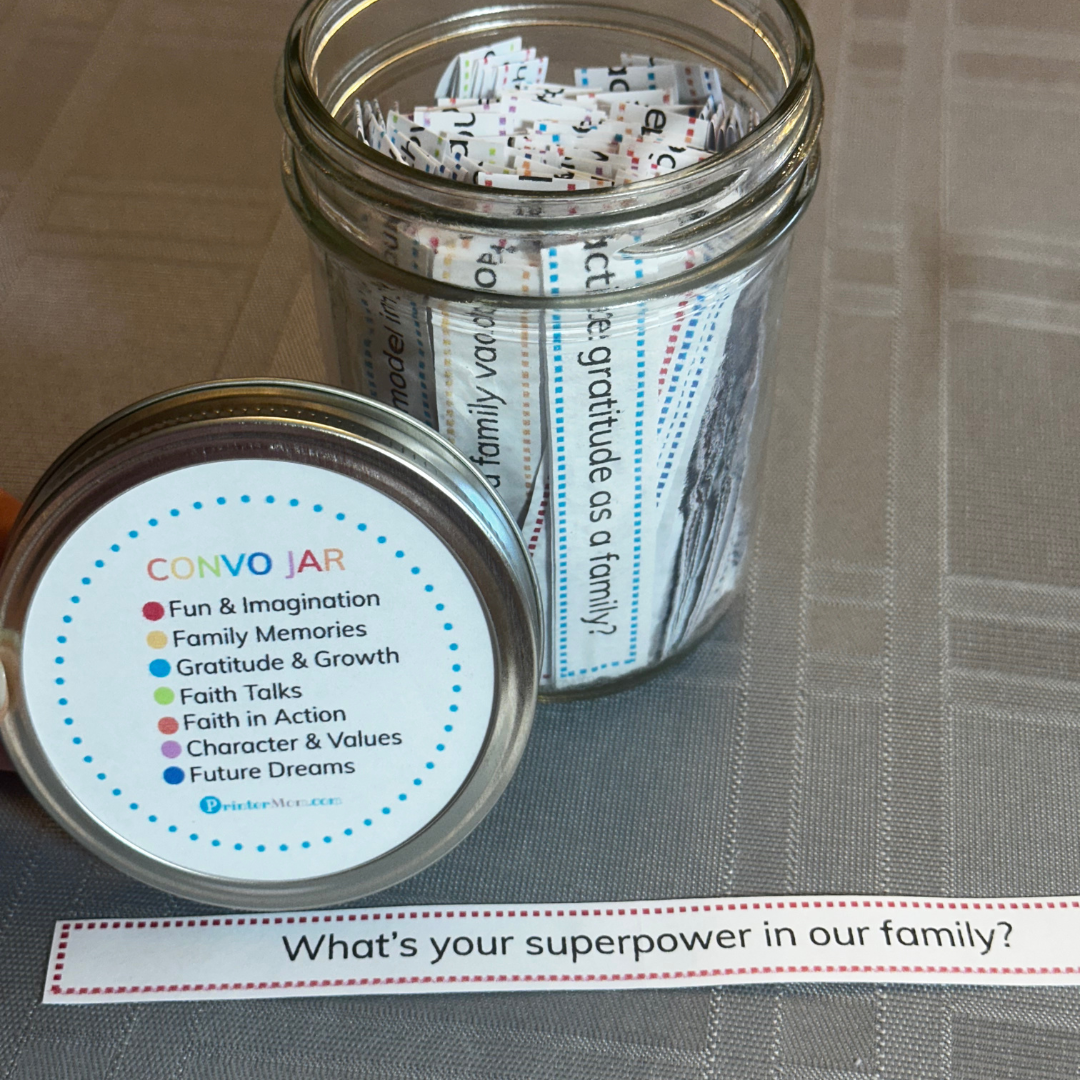 The Conversation in a Jar Complete Collection gives you 105 printable family conversation starters designed for busy families who want to laugh more, connect deeper, and grow in faith together.
