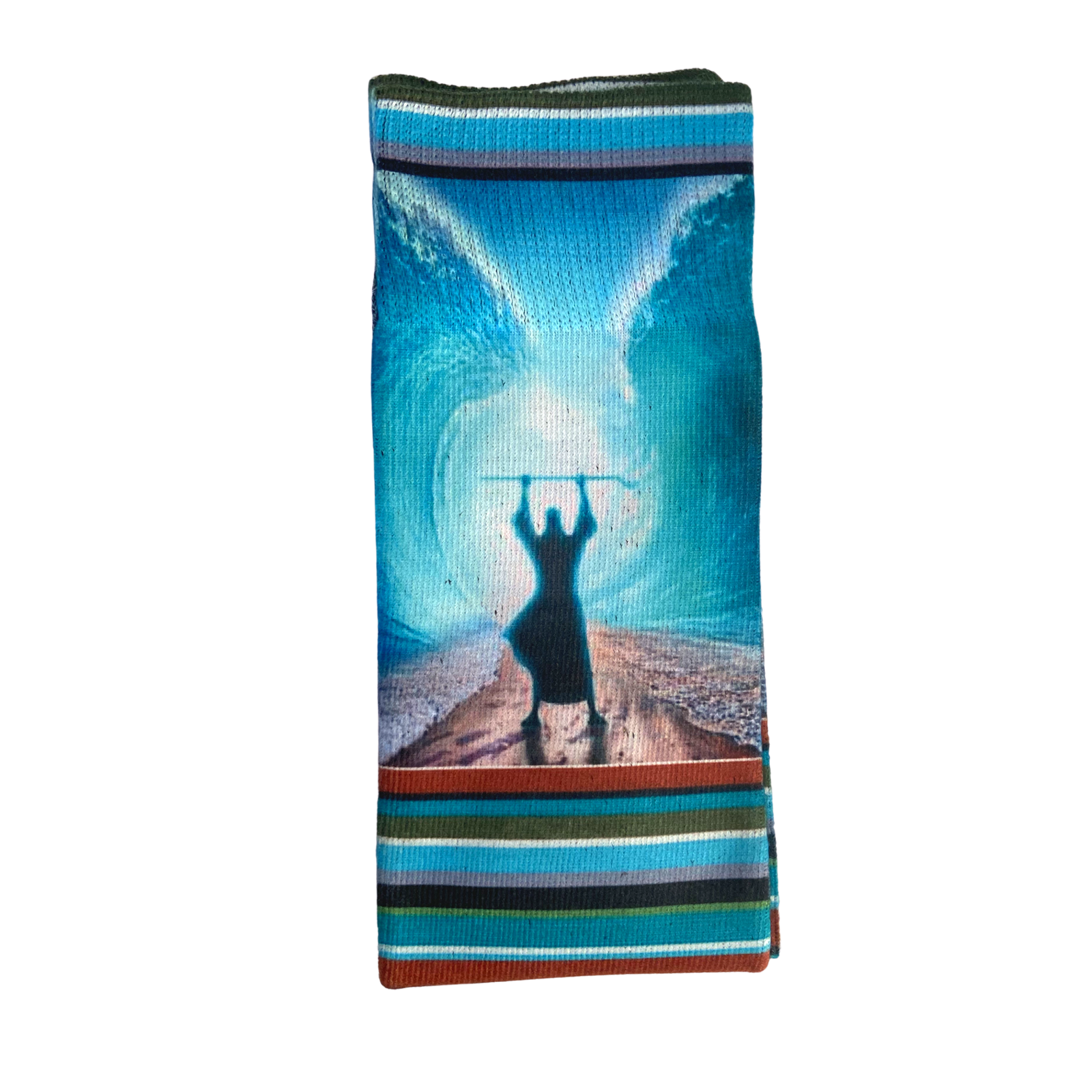 Check out Moses in all his majestic glory parting those waters like a boss!  We're pretty sure he was standing in front of the Red Sea while wearing these very sea-like, earthy colored, and all striped together BibleSocks.  Not today, Pharaoh!